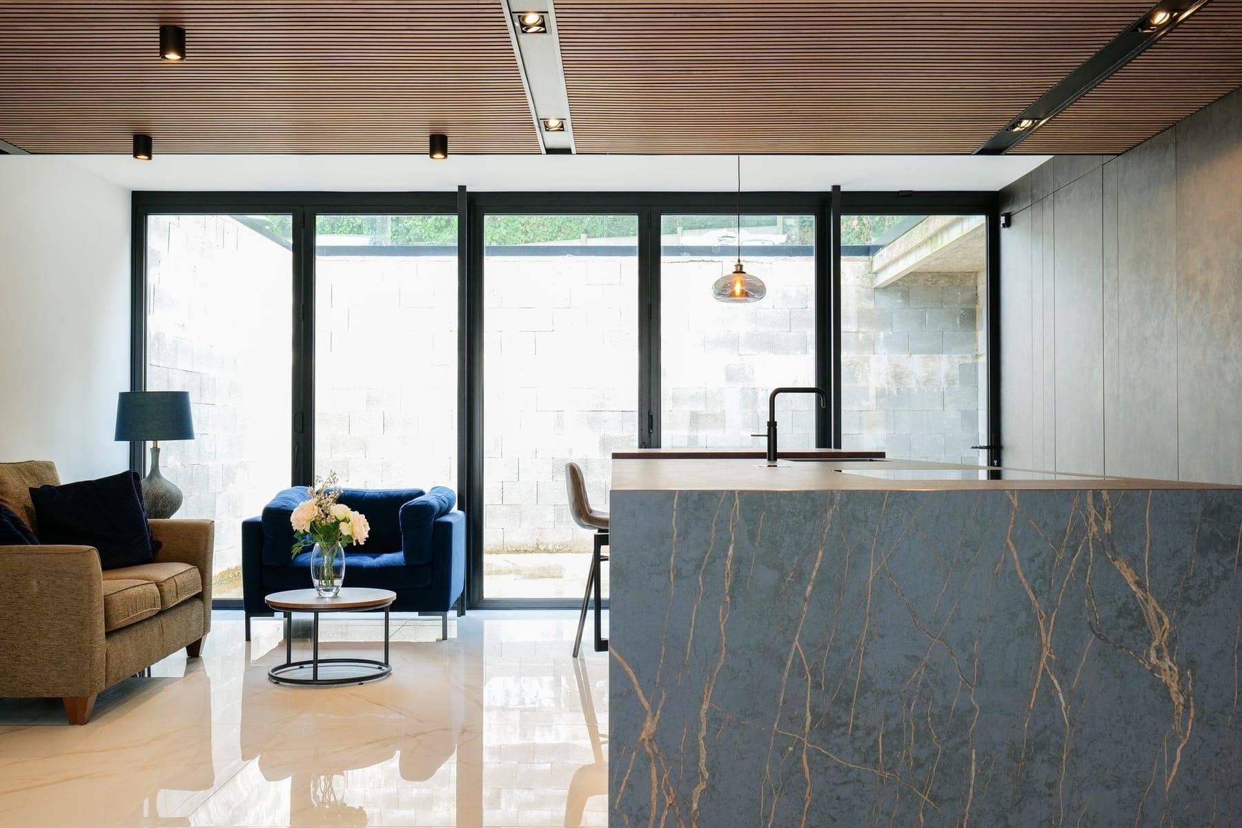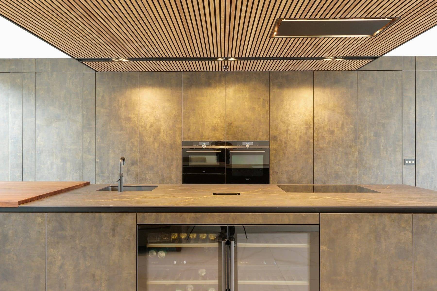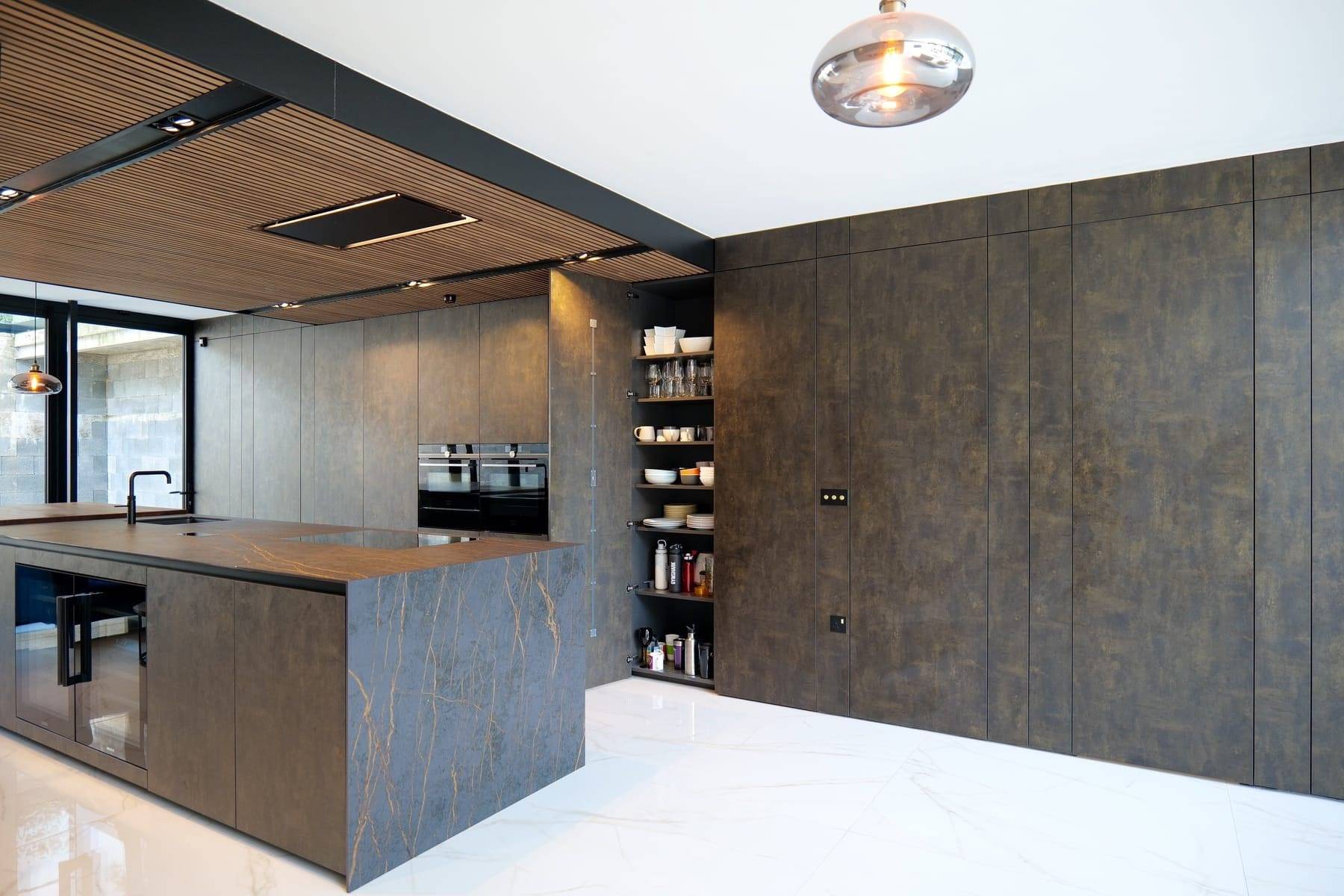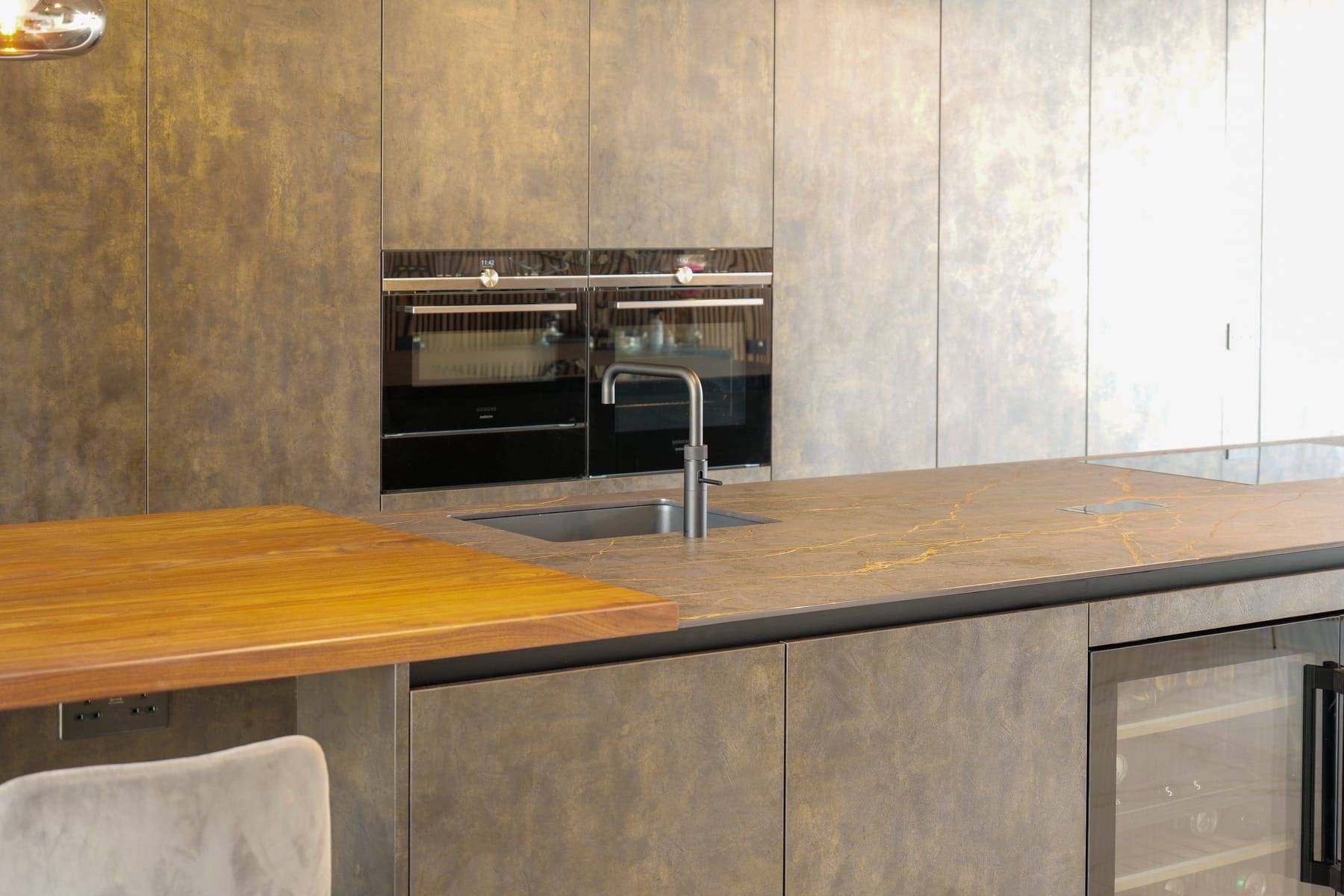 - 12mm Dekton Laurent Worktops with Bespoke Walnut breakfast bar.