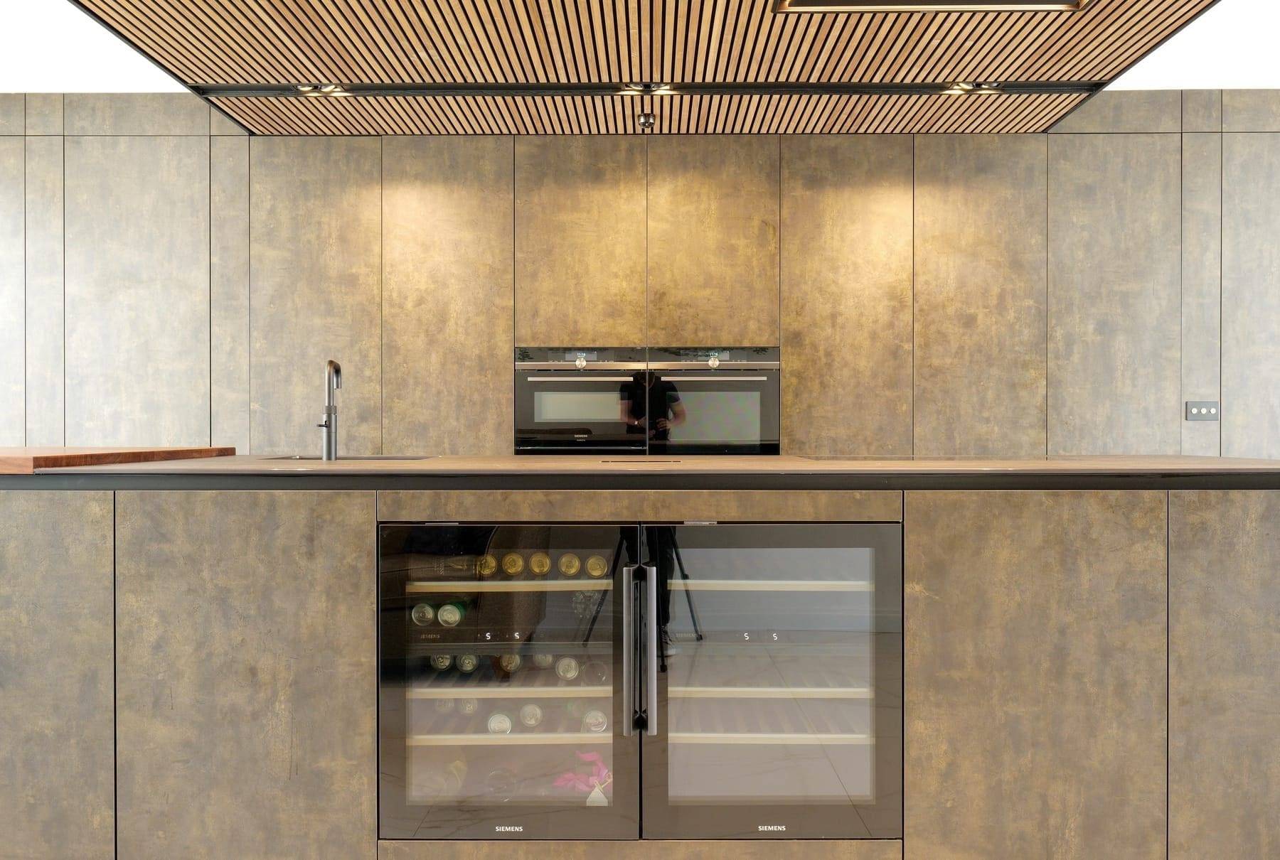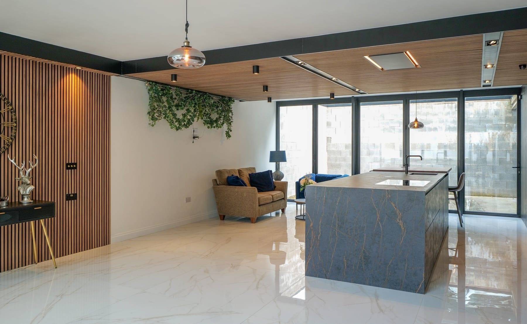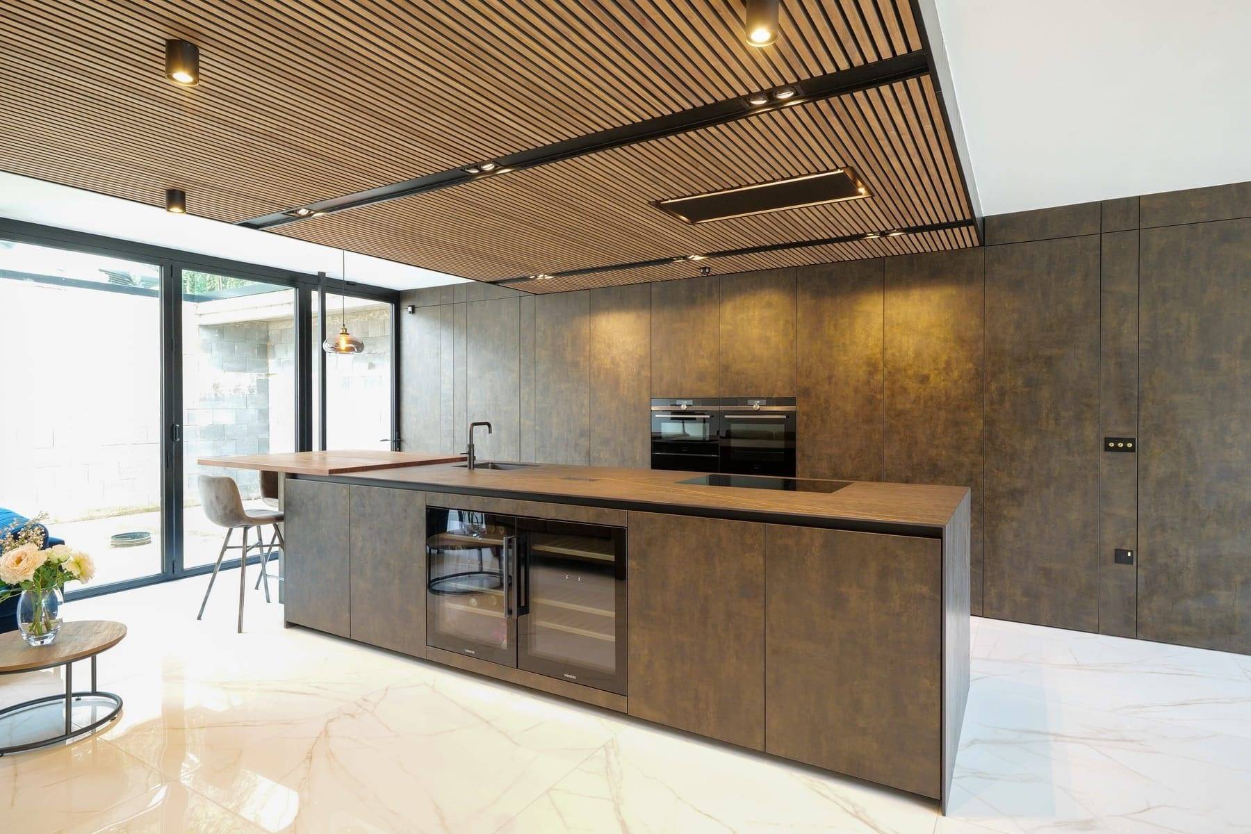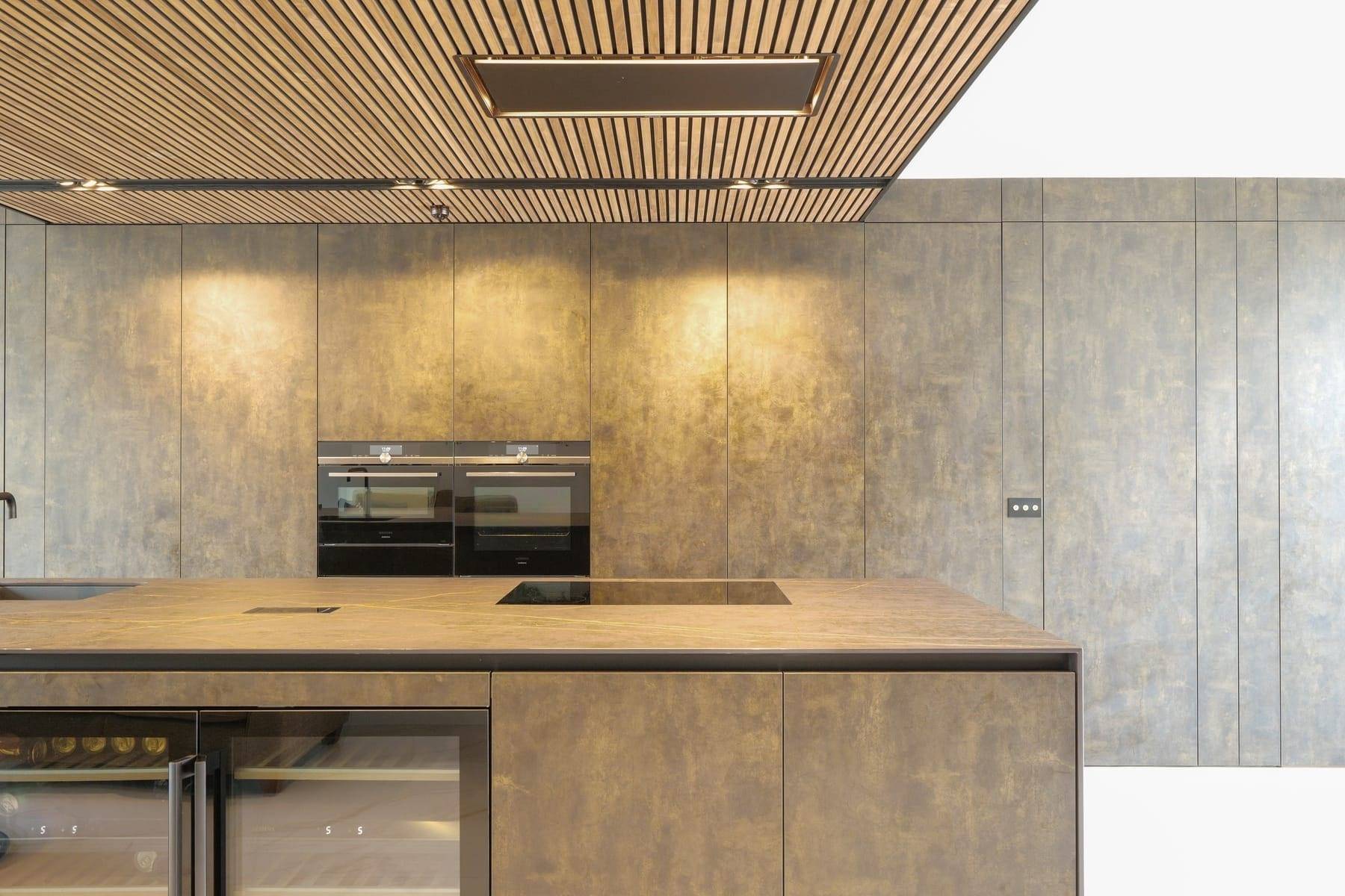 - 12mm Dekton Laurent Worktops with Bespoke Walnut breakfast bar.