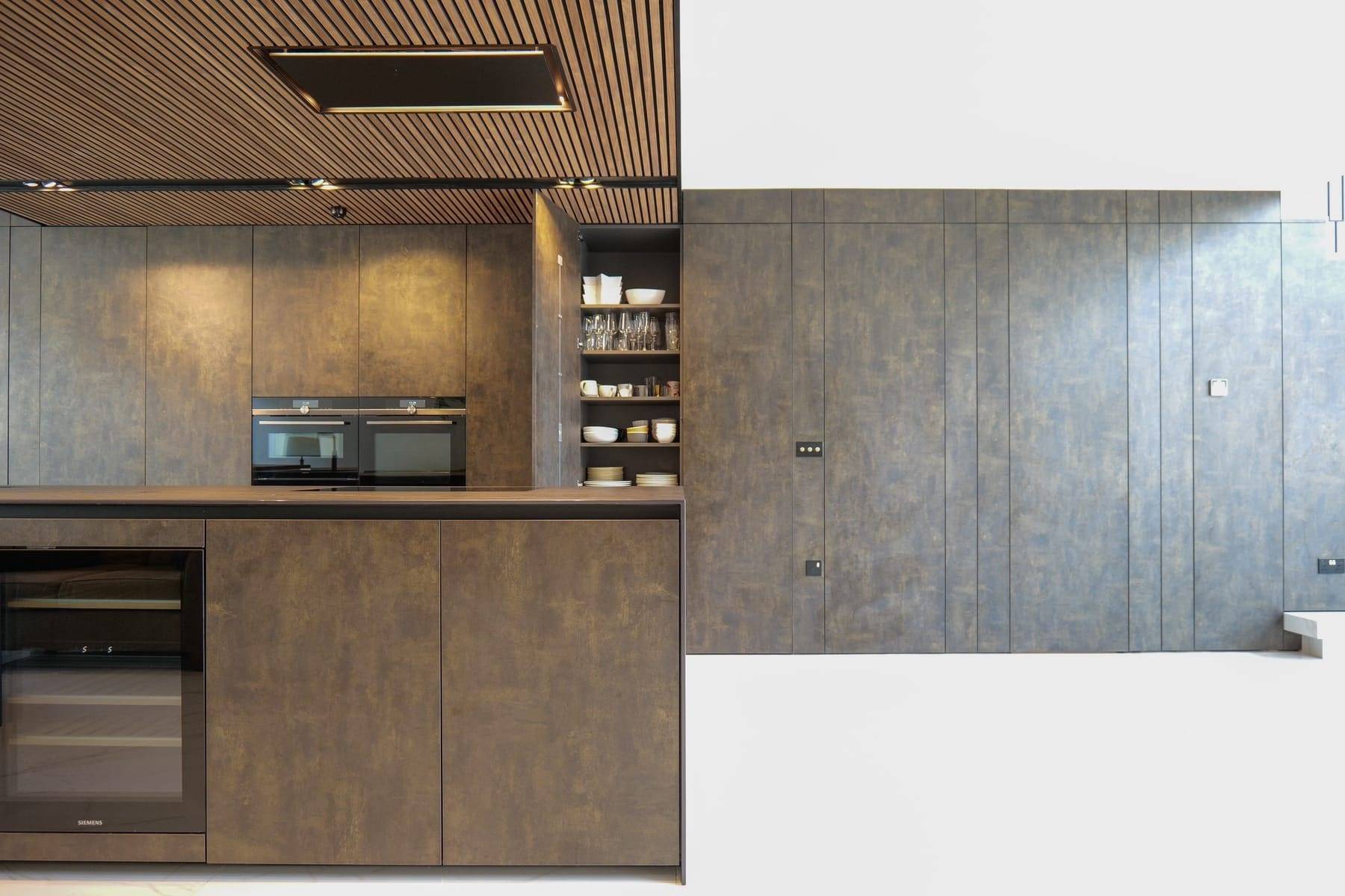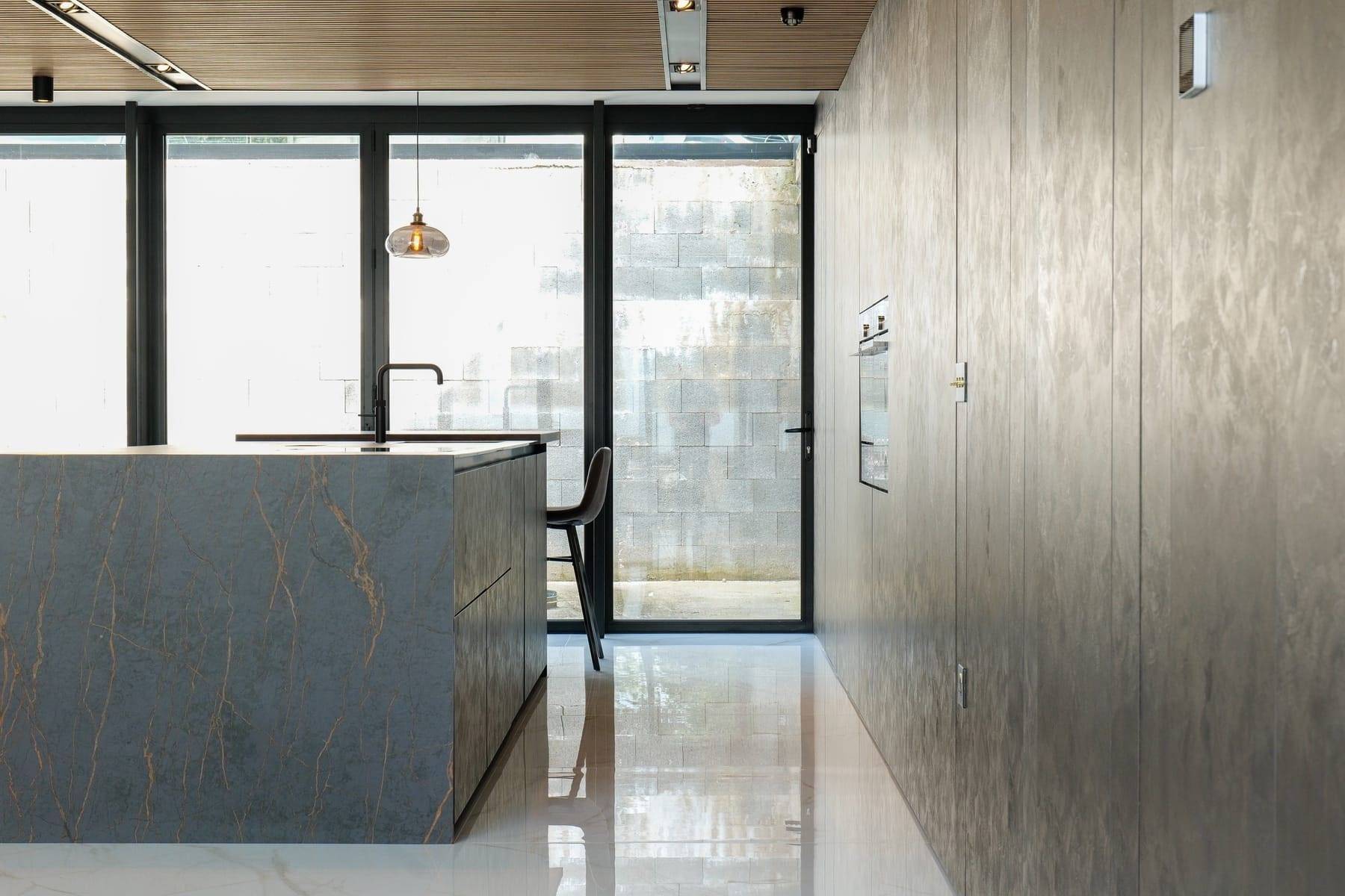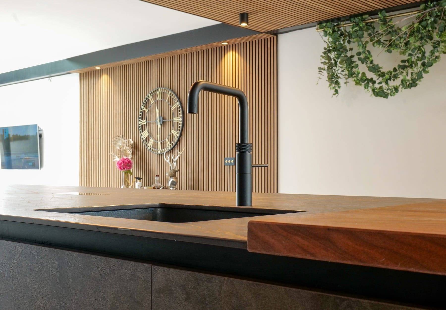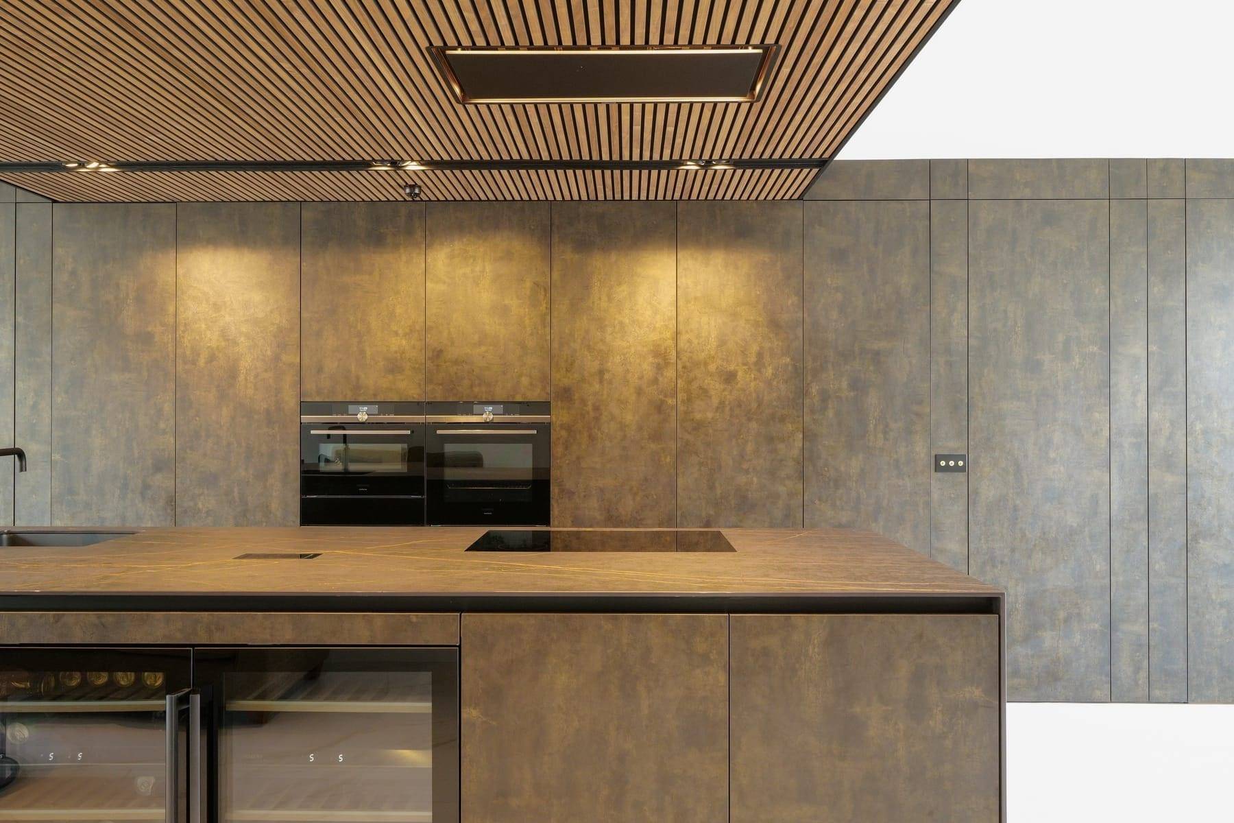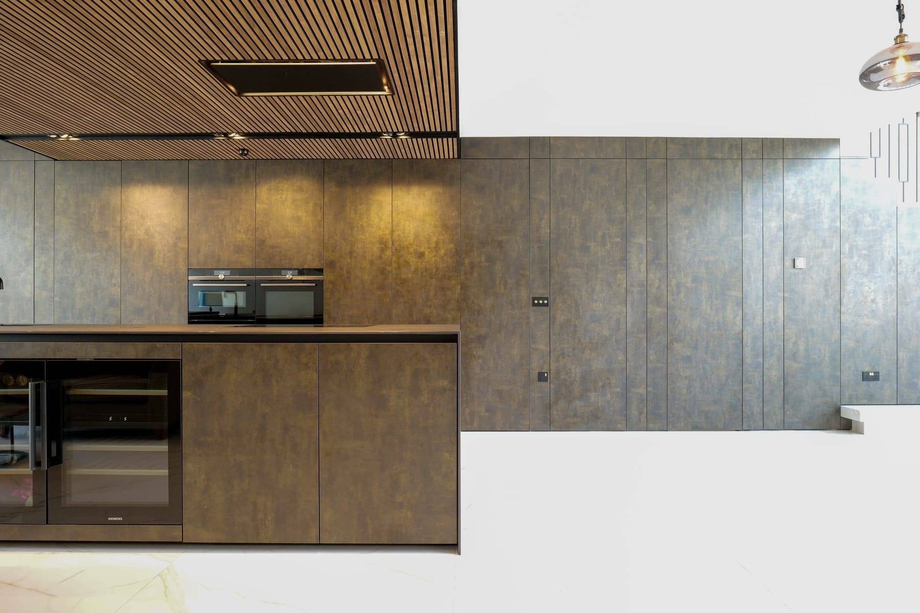 - 12mm Dekton Laurent Worktops with Bespoke Walnut breakfast bar.