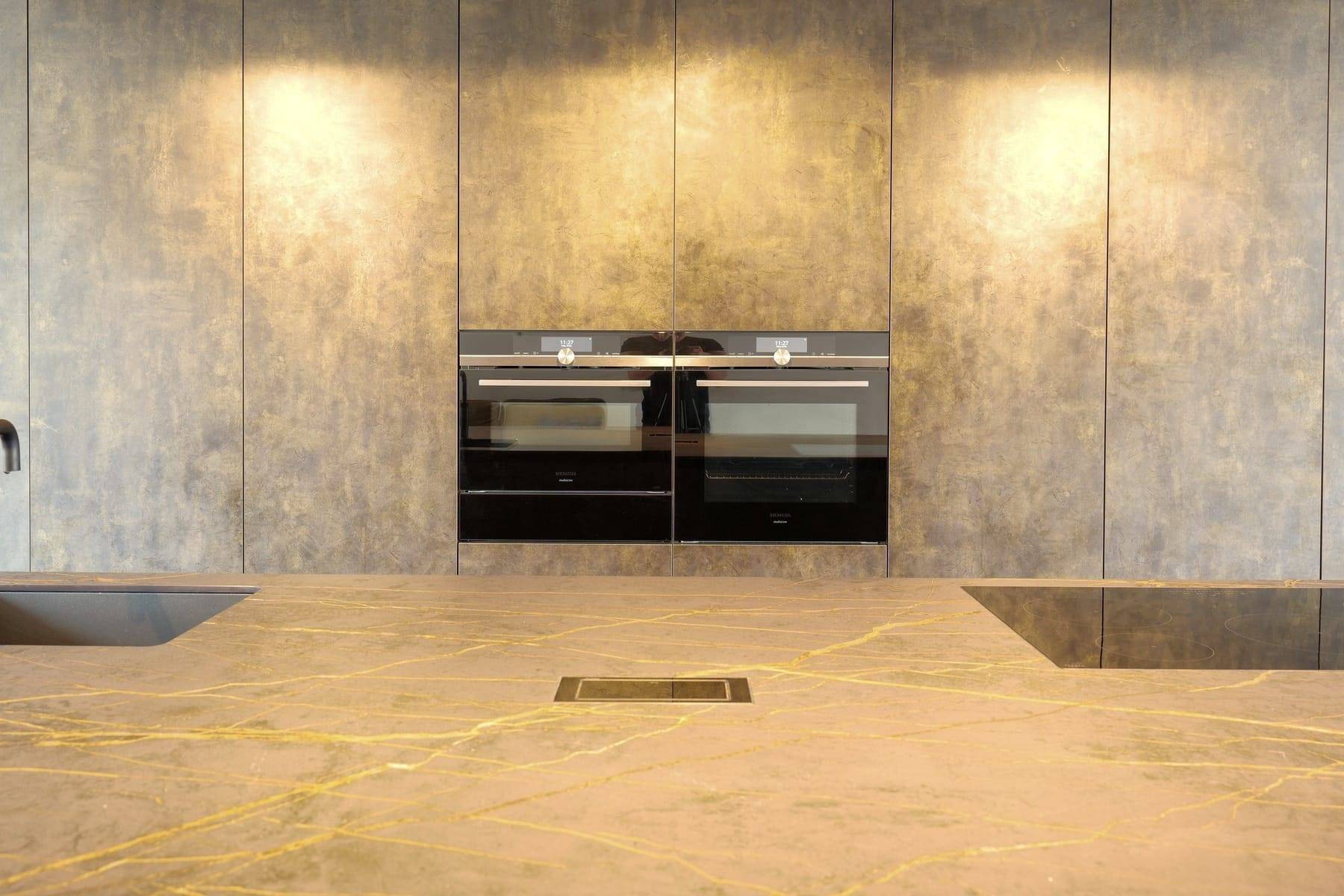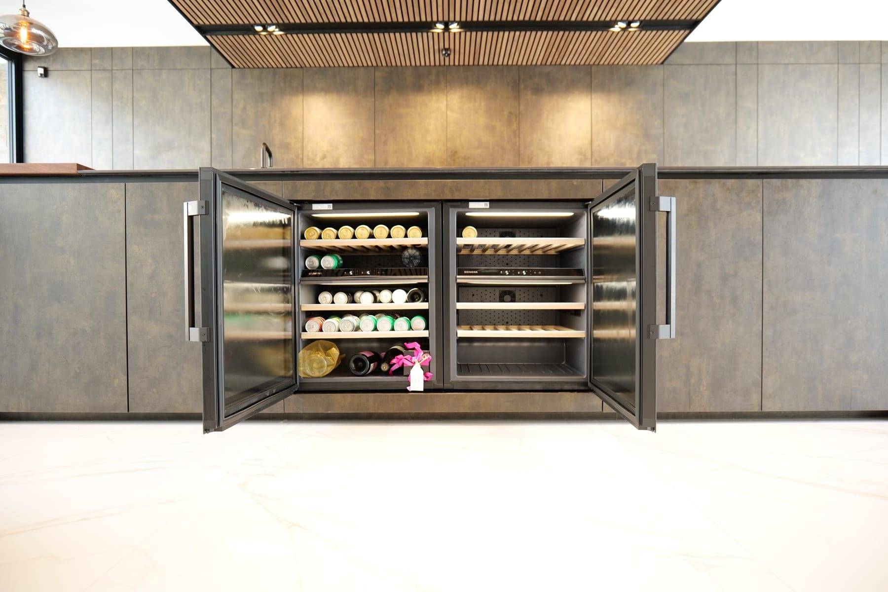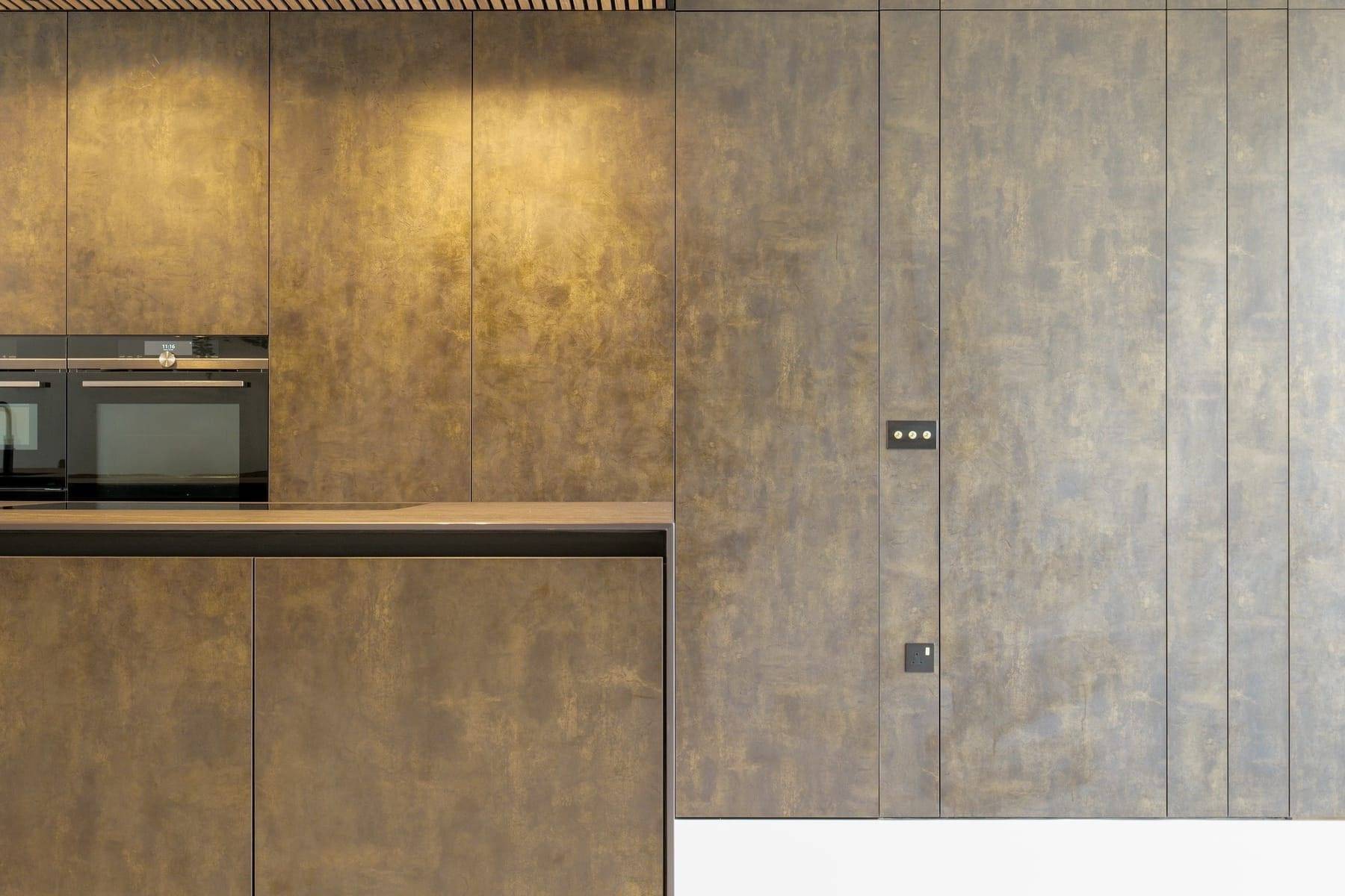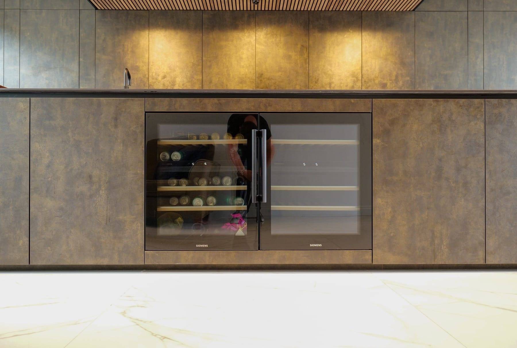 - 12mm Dekton Laurent Worktops with Bespoke Walnut breakfast bar.
