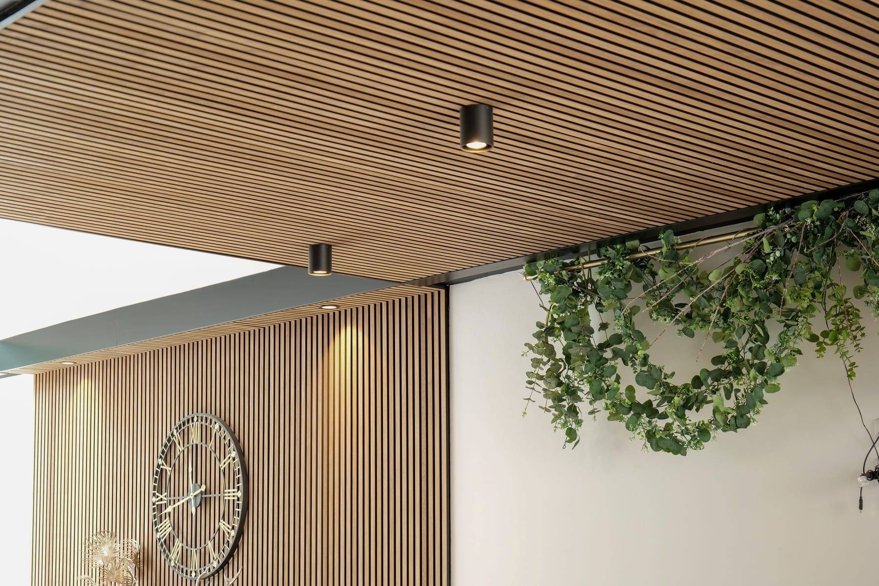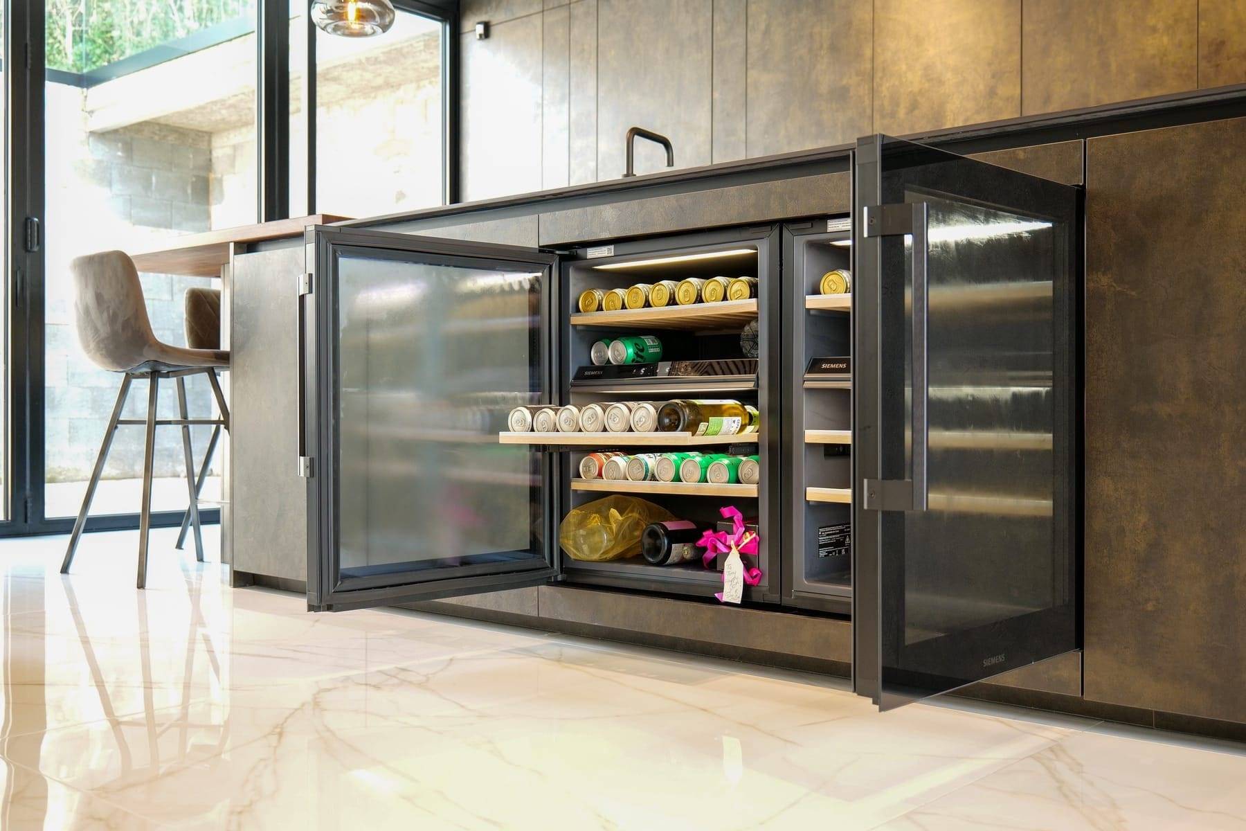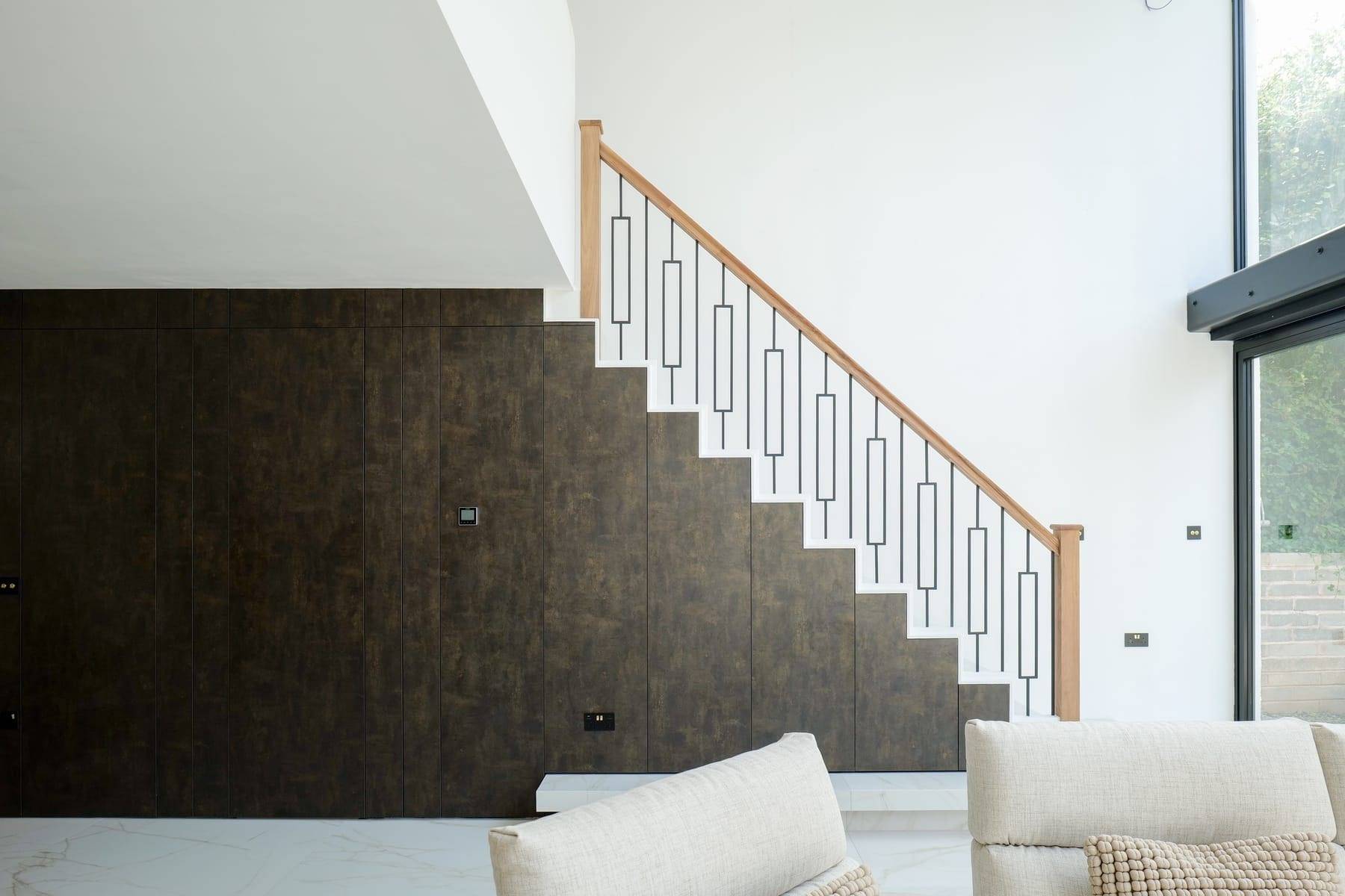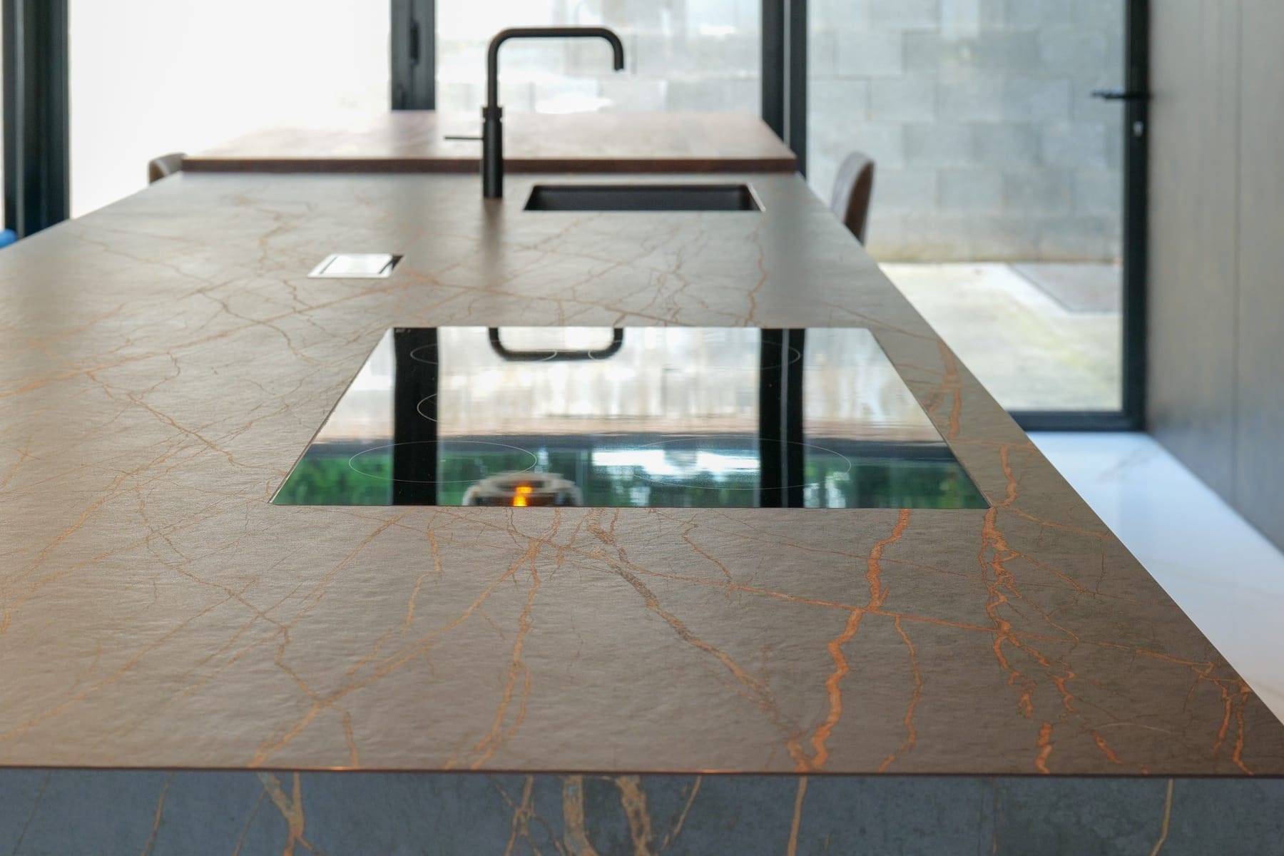 - 12mm Dekton Laurent Worktops with Bespoke Walnut breakfast bar.